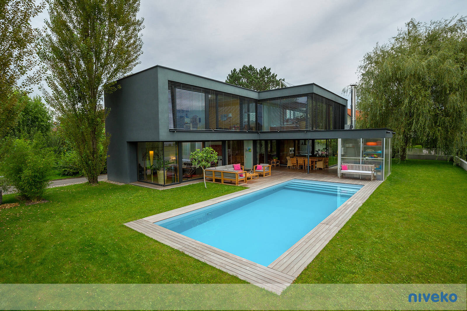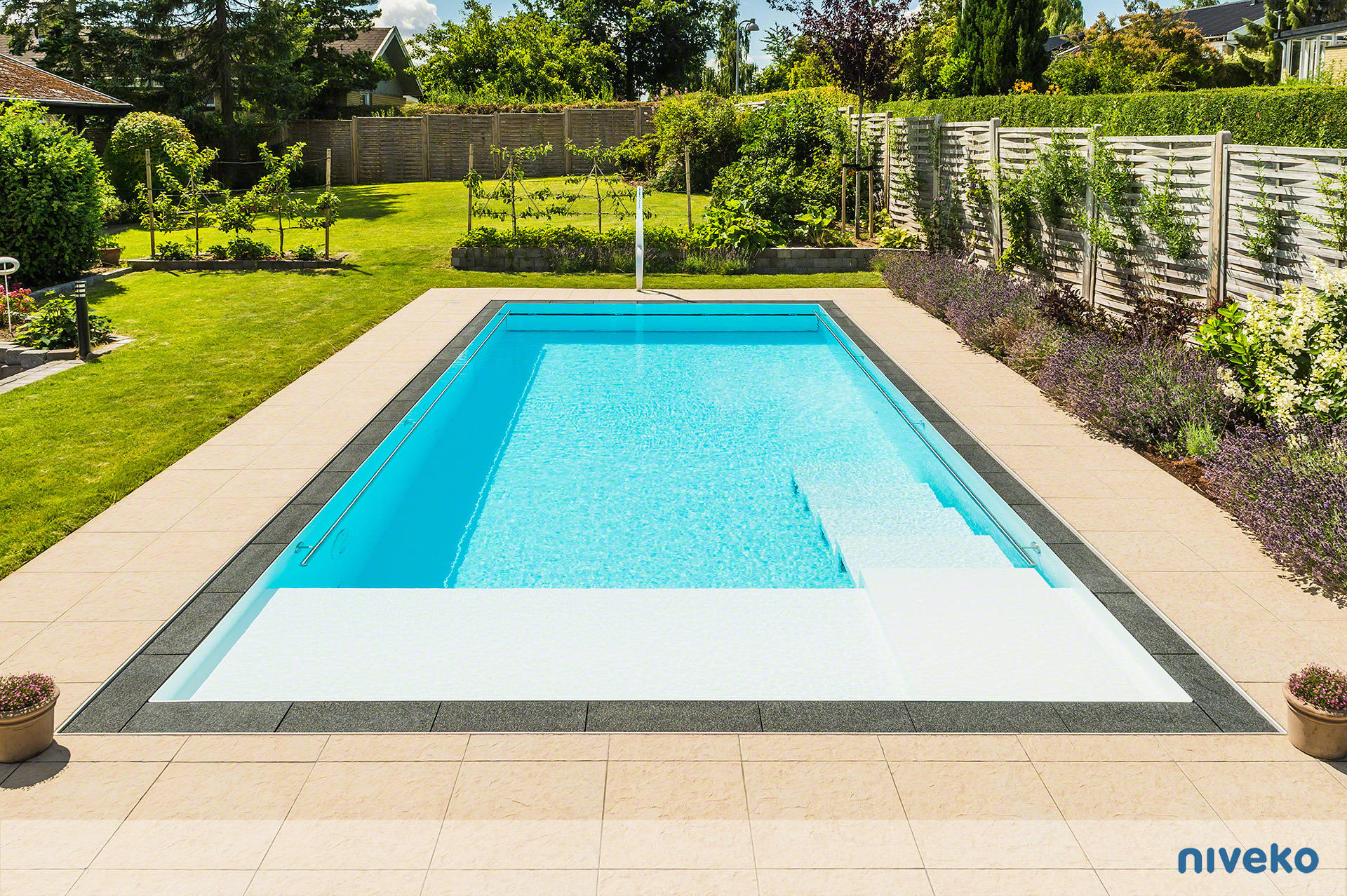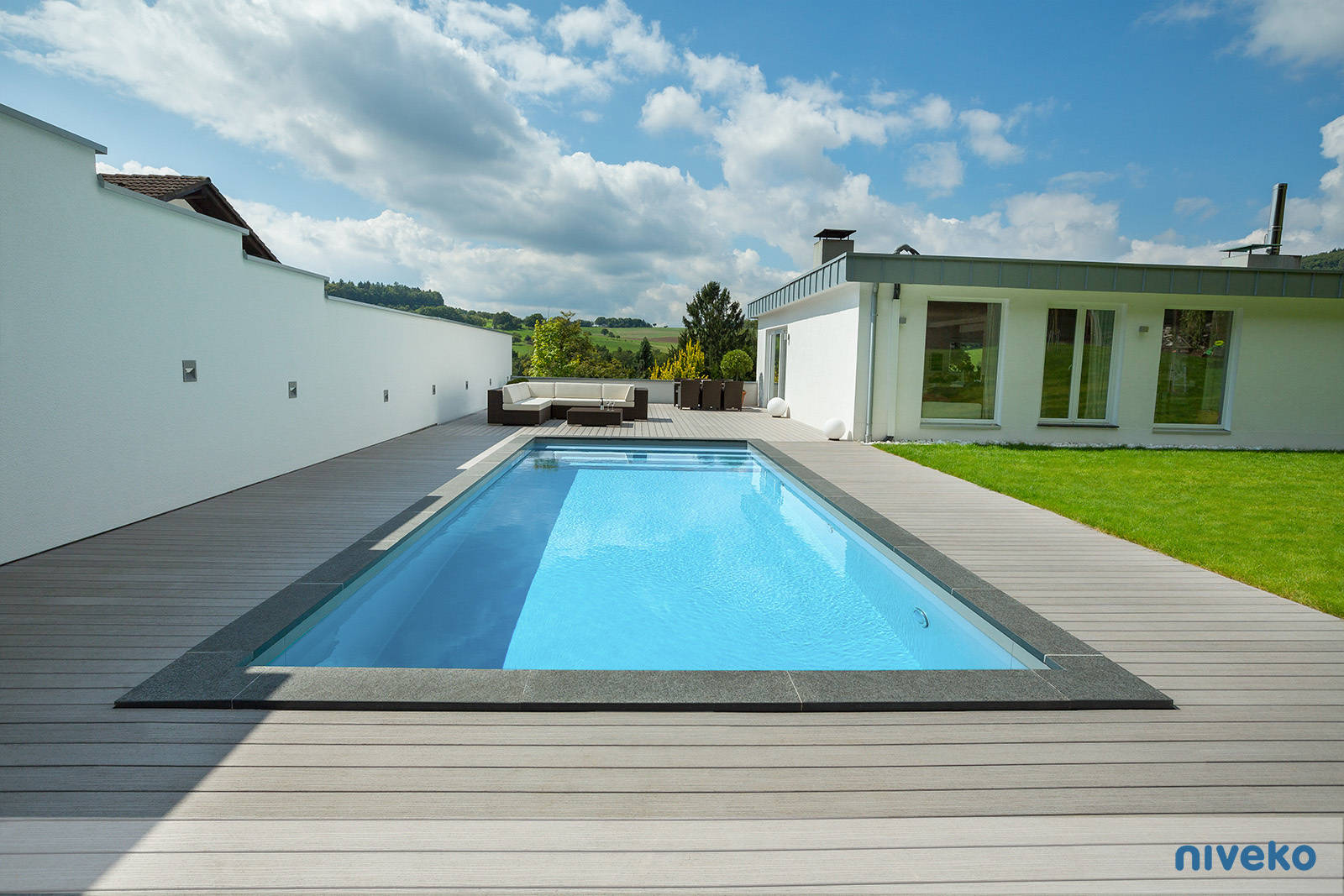 Der Niveko Pool wird nach Ihren individuellen Kundenwünschen und Massvorstellungen geplant und im Werk in Tschechien produziert. Jährlich verlassen mehr als 400 Niveko Schwimmbäder die auf höchste Qualität ausgerichtete Fabrikation. Durch den Werkstoff Polystone aus der Familie der Polypropylene ist eine Osmosebildung ausgeschlossen. Die Oberfläche ist absolut glatt. Das verwendete Material ist komplett durchgefärbt. Besonders im Bereich der Überlaufrinnenbecken bietet Niveko in Bezug auf Ästhetik und Optik das Mass aller Dinge. Die Becken sind wärmegedämmt und dadurch äusserst energieeffizient. Bei Skimmerbecken können auch hohe Wasserstände problemlos realisiert werden. Für den Einstieg stehen verschiedene Treppenvarianten zur Verfügung. Und schlichte Rollladenschächte gehören ebenso zum Poolprogramm. Als Ergänzung zum Pool stellt Niveko auch Unterflurtechnikschächte passend zur Poolanlage her. Und nicht zu vergessen ist die kurze Bauzeit für einen Niveko Pool.