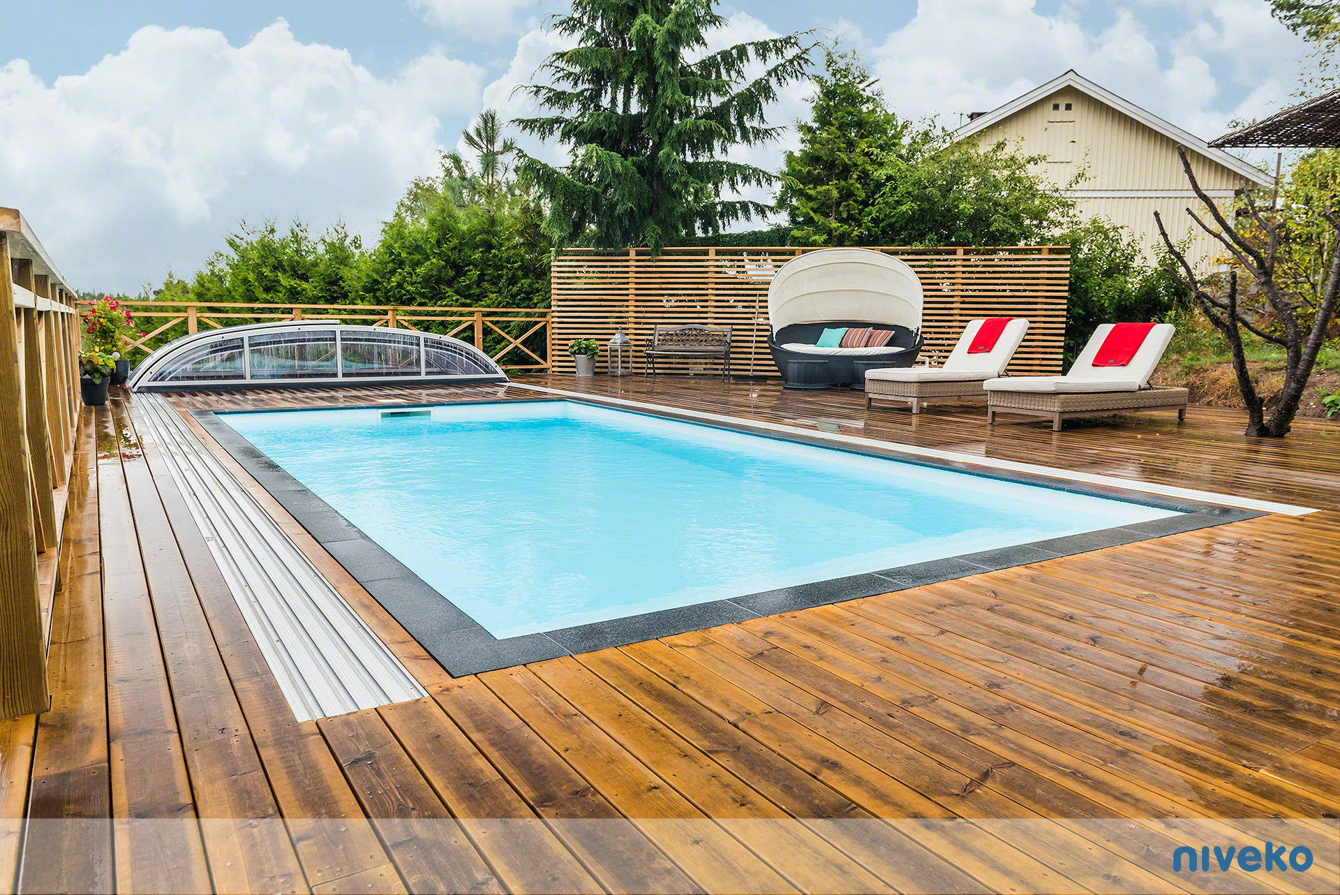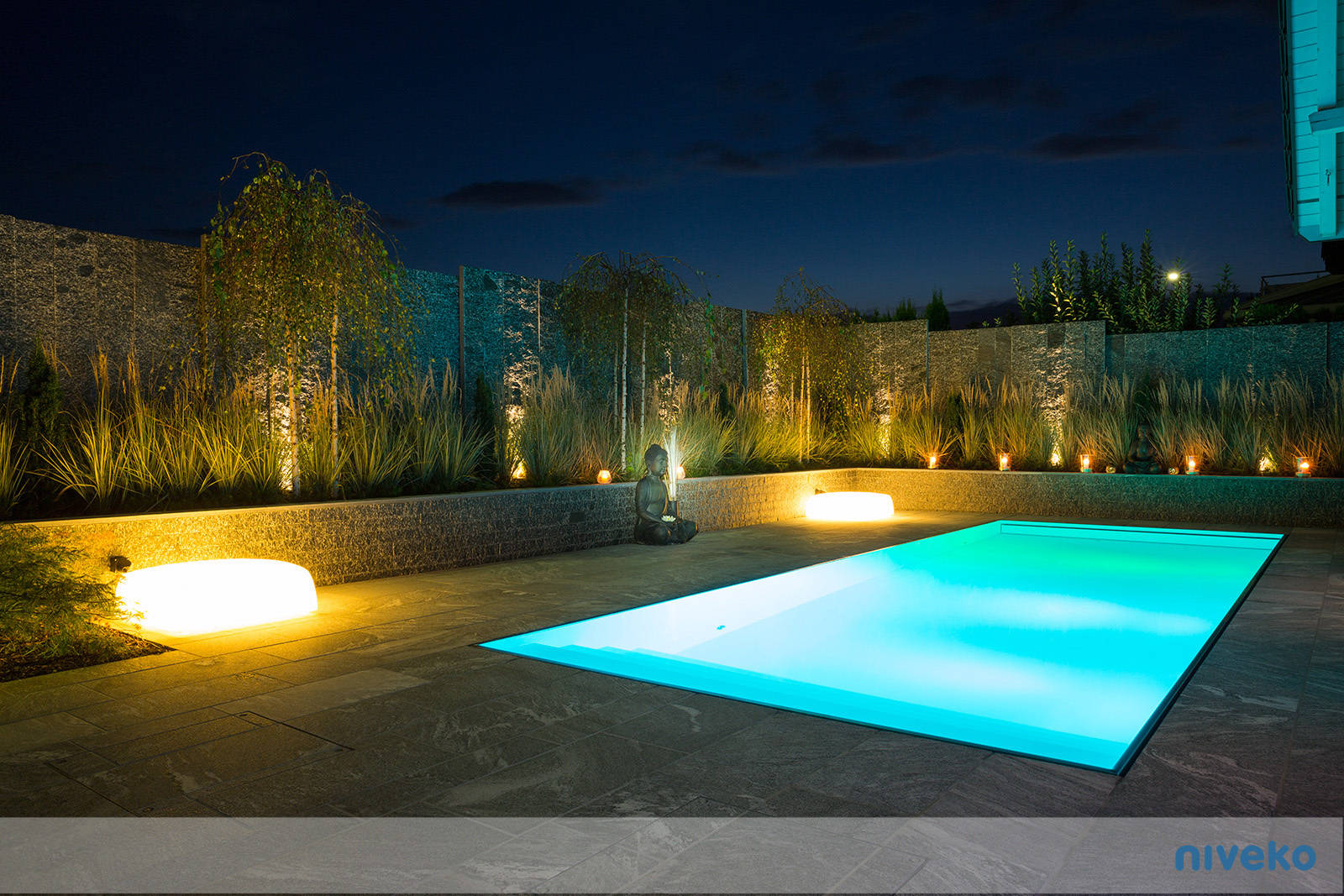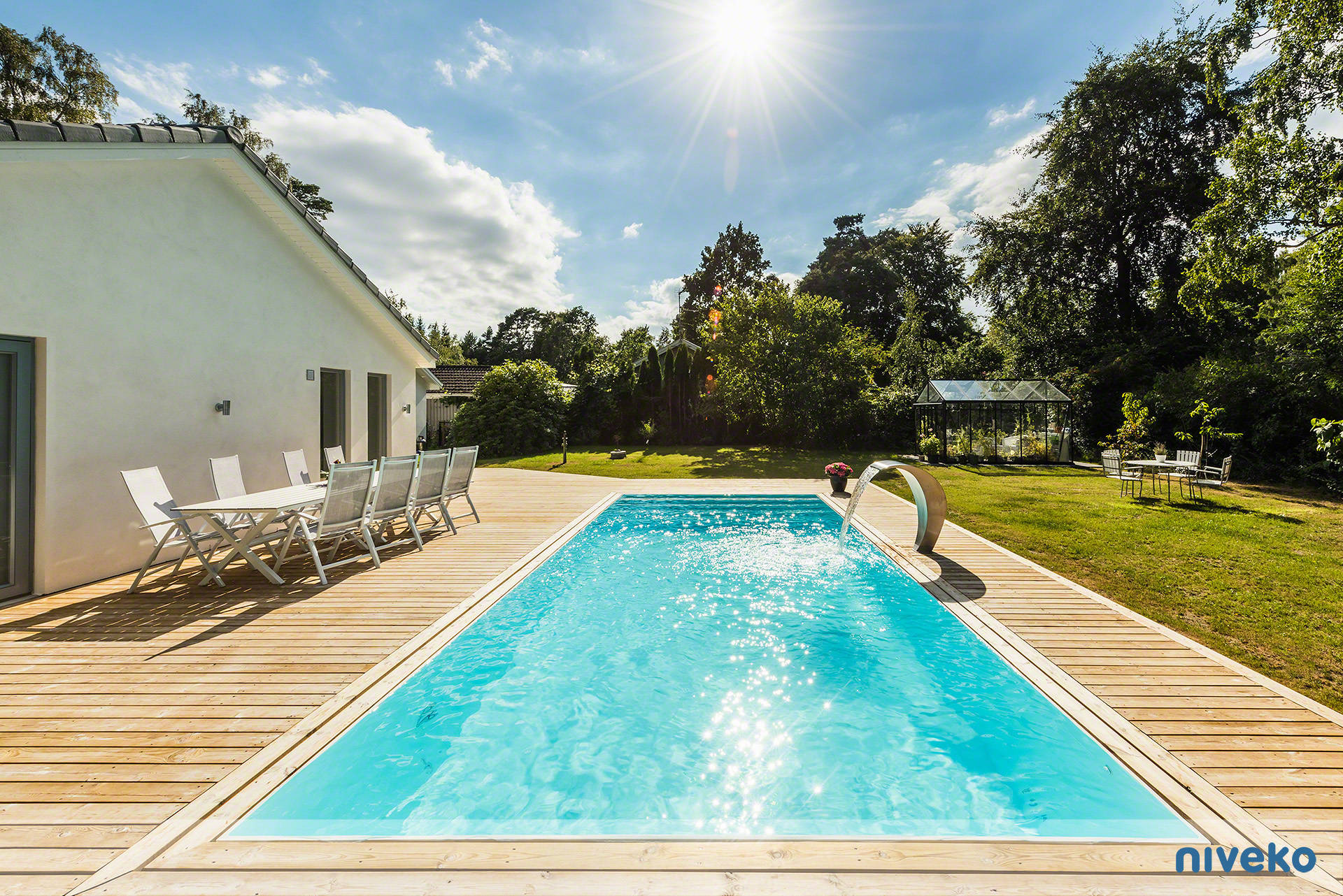 Der Niveko Pool wird nach Ihren individuellen Kundenwünschen und Massvorstellungen geplant und im Werk in Tschechien produziert. Jährlich verlassen mehr als 400 Niveko Schwimmbäder die auf höchste Qualität ausgerichtete Fabrikation. Durch den Werkstoff Polystone aus der Familie der Polypropylene ist eine Osmosebildung ausgeschlossen. Die Oberfläche ist absolut glatt. Das verwendete Material ist komplett durchgefärbt. Besonders im Bereich der Überlaufrinnenbecken bietet Niveko in Bezug auf Ästhetik und Optik das Mass aller Dinge. Die Becken sind wärmegedämmt und dadurch äusserst energieeffizient. Bei Skimmerbecken können auch hohe Wasserstände problemlos realisiert werden. Für den Einstieg stehen verschiedene Treppenvarianten zur Verfügung. Und schlichte Rollladenschächte gehören ebenso zum Poolprogramm. Als Ergänzung zum Pool stellt Niveko auch Unterflurtechnikschächte passend zur Poolanlage her. Und nicht zu vergessen ist die kurze Bauzeit für einen Niveko Pool.